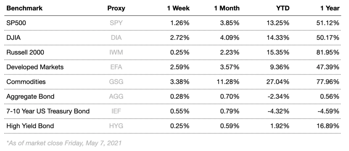 Markets rose this week on mostly disappointing economic data. On the positive side, initial unemployment claims set another new pandemic era record low for the third consecutive week, beating analyst expectations. The biggest news of the week was the dramatic miss in expectations of non-farm payrolls. Consensus expectations were for hiring to come in at roughly 1 million for the month of April, but actual hiring tallied at just 266K. Markets reacted warmly to the news however, as analysts are now more confident that the Fed will not be adjusting monetary policy any time soon. Manufacturing and services PMI data also disappointed, with both readings declining and missing expectations. Overall, in spite of the week’s disappointing data readings, the economy remains well positioned to perform exceptionally in 2021 based on overall macroeconomic position. New COVID-19 infections moved substantially lower again this week, with 7 day moving averages decreasing by around 7K a day over the prior week. The most recent infection data puts the moving average below 45K new infections a day for the first time since early October.