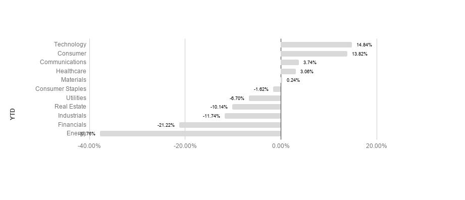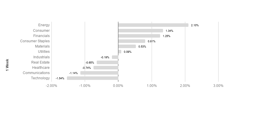 Broad market equity indices finished the week mostly down, with major large cap indices performing comparably to small cap. Economic data has continued to be mostly positive, but the global recovery still has a long way to go to regain lost jobs and output. S&P sectors returned mixed results this week, as broad market movements showed investors favoring non defensive sectors. Energy led the best performing sectors, followed by consumer discretionary, returning 2.10% and 1.34% respectively. Communications and technology performed the worst, posting -1.14% and -1.54% respectively. Technology leads the pack so far YTD, returning 14.84% in 2020.