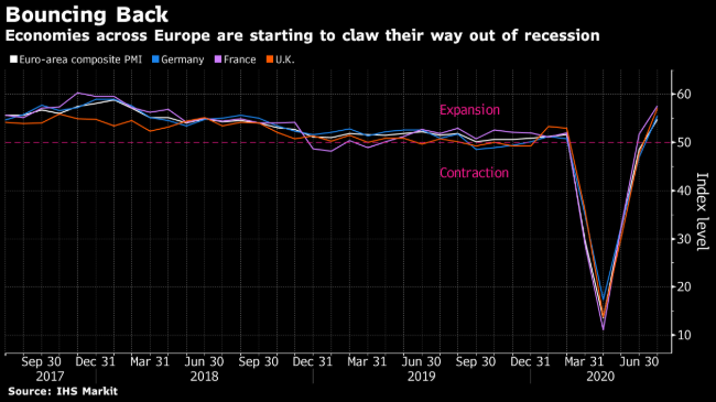 European private sector activity roared back to growth levels in June, as economies began unwinding restrictions put in place due to Covid-19. PMI numbers of the continent’s largest economies all returned levels above the expansionary level of 50.