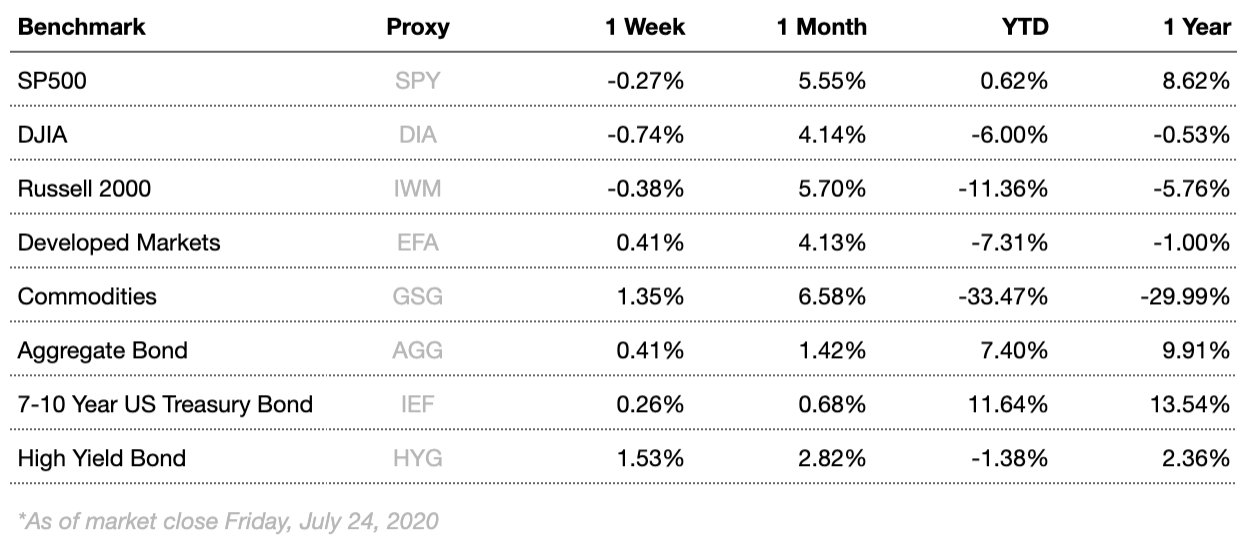Overseas markets were mixed, as uncertainty surrounding the global economic recovery weighed. All major European indices returned negative results for the week. Japanese equities returned positive performance, but on a shortened trading week due to holiday. As global economies continue to work towards reopening, analysts are hoping Covid-19 infections are brought back under control so that focus can dial in more on global recovery efforts. Markets fell last week, with most equity indices bringing in negative returns. Fears concerning global stability and health are an unexpected factor in asset values, and the recent volatility serves as a great reminder of why it is so important to remain committed to a long-term plan and maintain a well-diversified portfolio. When stocks were struggling to gain traction last month, other asset classes such as gold, REITs, and US Treasury bonds proved to be more stable. Flashy news headlines can make it tempting to make knee-jerk decisions, but sticking to a strategy and maintaining a portfolio consistent with your goals and risk tolerance can lead to smoother returns and a better probability for long-term success.