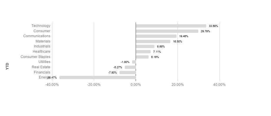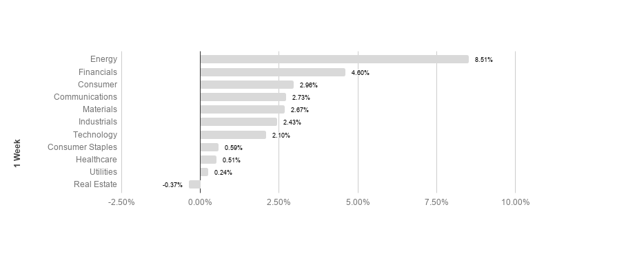 Broad market equity indices finished the week mostly positive, with major large cap indices underperforming small cap. Economic data has been solid, but the global recovery is still threatened by COVID-19. S&P sectors returned mostly positive results this week. Energy and financials outperformed, returning 8.51% and 4.60% respectively. Utilities and real estate underperformed, posting 0.24% and -0.37% respectively. Technology leads the pack so far YTD, returning 33.69% in 2020.