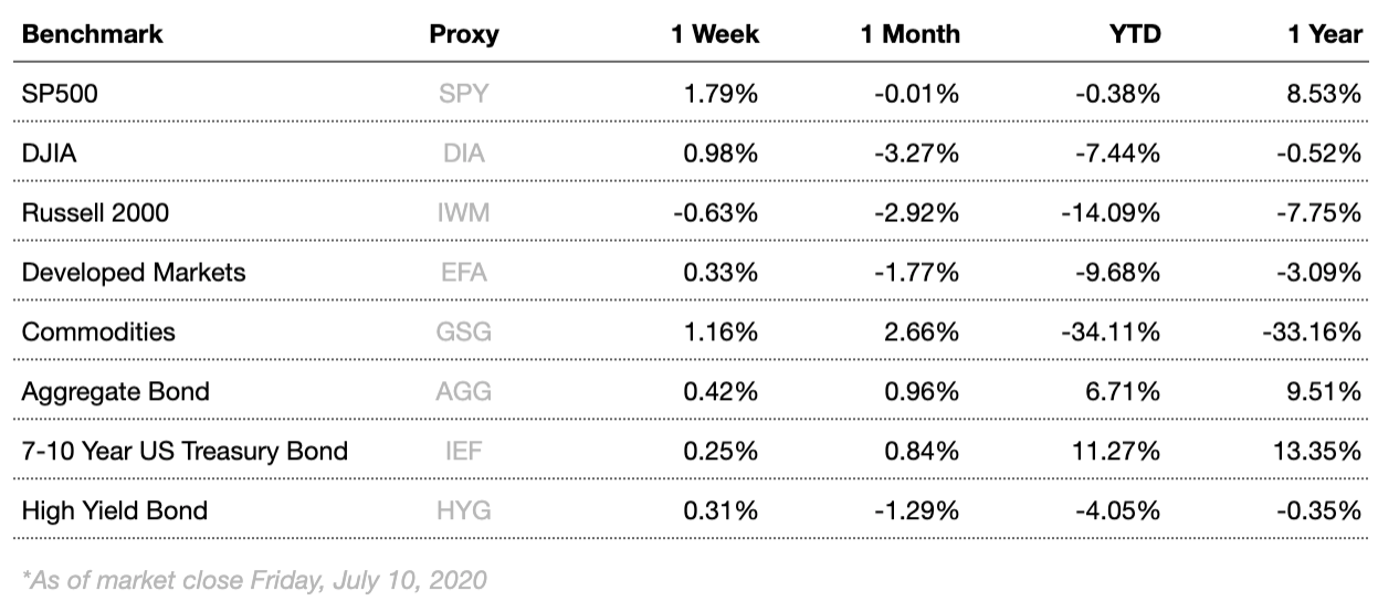Stocks rose again this week in light of new economic data. While new cases of Covid-19 have caused some states to begin restricting activities and infection rates seem to be increasing, new encouraging data seemed to win out in markets for the second consecutive week. Manufacturing and unemployment claims both moved in encouraging directions, returning results which beat expectations, helping to propel equities to finish the week mostly in the positive. Generally, hiring and manufacturing progress has encouraged investors, as they tend to be very reliable economic indicators. Both areas have a long way to go to recover lost ground resulting from the pandemic, but the pace of recovery so far has exceeded analyst expectations.