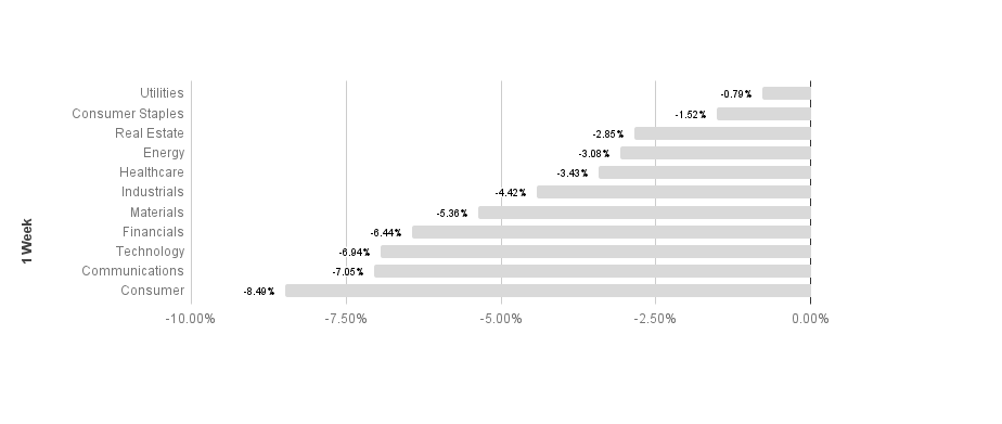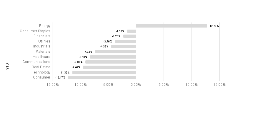 S&P sectors were negative this week. Utilities and consumer staples outperformed, returning -0.79% and -1.52% respectively. Communications and consumer discretionary underperformed, posting -11.36% and -12.17% respectively. Energy remains the only sector with a positive return YTD, posting 12.79%.