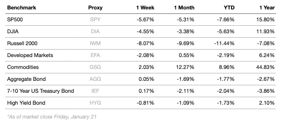 Equity markets sold off this week, with indices finishing down across the board. Fear seems to have spiked recently, as this marks the third consecutive week of declines. While it’s difficult to pin down an exact cause, a swarm of negative geopolitical movements as well as economic concerns seem to be prevailing. The Omicron variant appears to be at its zenith, inflation continues to rise, and the Kremlin continues to threaten Ukraine. Long term however, all of these issues should fade. In spite of the less-than-stellar news this week, the economy is still recovering well from pandemic lockdowns. The biggest threat to the economy remains inflation, and the Fed now appears to be taking the threat more seriously.