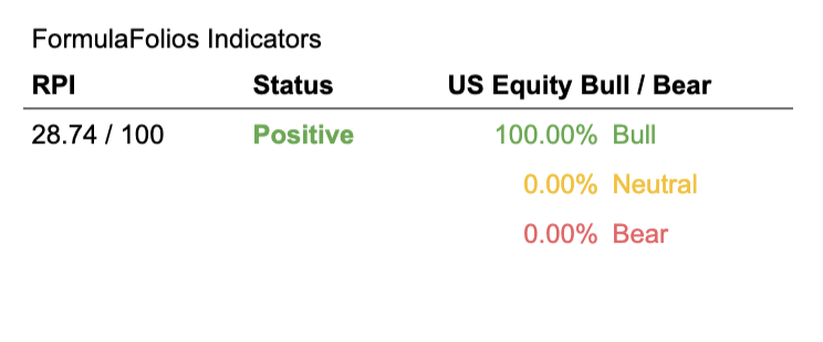 The Recession Probability Index (RPI) has a current reading of 28.74, forecasting a lower potential for an economic contraction (warning of recession risk). The Bull/Bear indicator is currently 100% bullish, meaning the indicator shows there is a slightly higher than average likelihood of stock market increases in the near term (within the next 18 months).