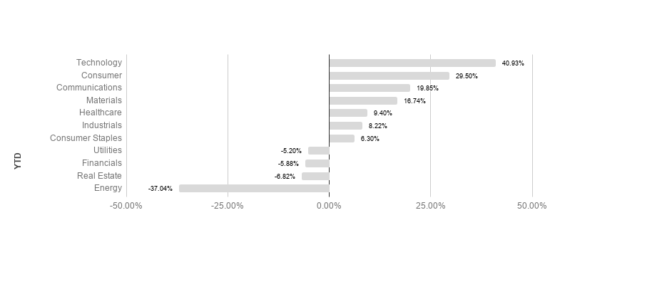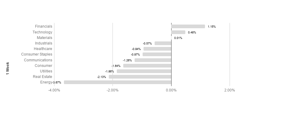 Broad market equity indices finished the week down, with major large cap indices underperforming small cap. Economic data has been mostly solid, but the global recovery has a long way to go to recover from COVID-19 lockdowns. S&P sectors returned mostly negative results this week. Financials and technology outperformed, returning 1.15% and 0.48% respectively. Real estate and energy underperformed, posting -2.13% and -3.67% respectively. Technology leads the pack so far YTD, returning 40.93% in 2020.