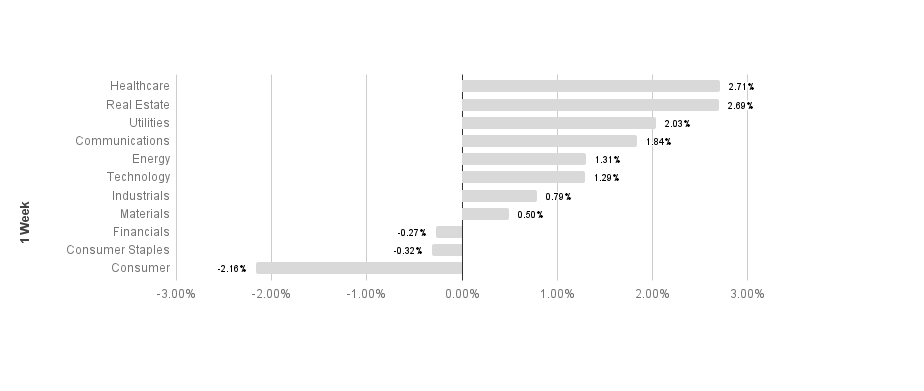 S&P sectors were mostly positive this week. Healthcare and real estate outperformed, returning 2.71% and 2.69% respectively. Consumer staples and consumer discretionary underperformed, posting -0.32% and -2.16% respectively. Energy holds the lead YTD, posting 23.37%.