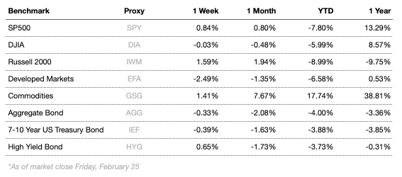US equities rose this week even as war broke out with the Russian invasion of Ukraine. Economic indicators were mostly positive, with durable goods and PMI readings coming in above expectations. PCE inflation numbers indicate that inflation continues to run hot, further highlighting the need for urgency to get inflation under control. While war is never a welcome headline, the primary risk to the US economy right now remains inflation. Time will tell whether the Fed is doing too little too late on inflation, but their willingness to act late is better than continuing to invoke that inflation is “transitory.” Overall, the economy is still recovering well from pandemic lockdowns. The biggest threat to the economy remains inflation, and the Fed now appears to be taking the threat more seriously.
