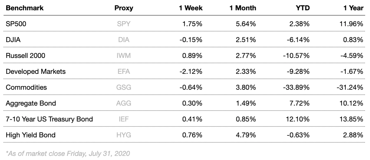 Broad market equity indices finished the week mixed, with major large cap indices outperforming small cap. Economic data has continued to be mostly positive, but the global recovery still has a long way to go to regain lost jobs and output. S&P sectors returned mixed results this week, as broad market movements showed investors favoring defensive sectors. Technology and real estate led the best performing sectors, returning 4.98% and 4.19% respectively. Materials and energy performed the worst, posting -1.81% and -4.23% respectively. Technology leads the pack so far YTD, returning 20.56% in 2020.