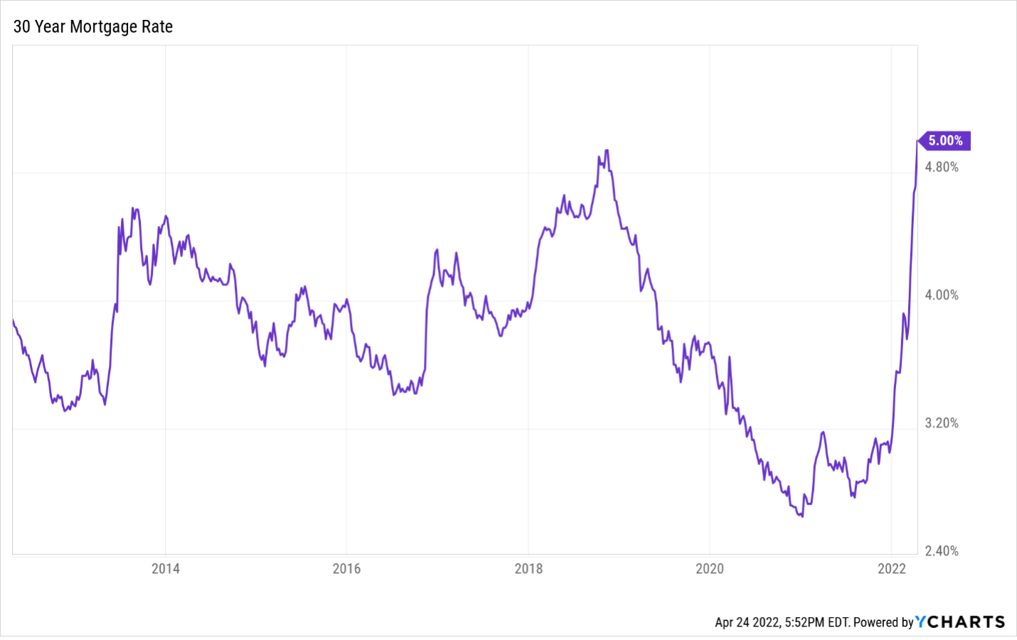 The housing market has been robust with house prices rising rapidly. This surge in home prices was supported by fiscal and monetary stimulus efforts, but also low interest rates. Fiscal and monetary stimulus is no longer supportive. Mortgage rates have surged higher. The average 30-year mortgage rate has now hit 5%, its highest level in a decade.