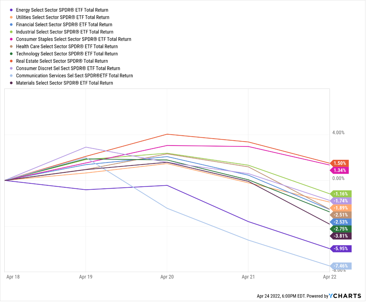 Tech stocks led a broad-based market sell-off with all three major stock indexes (Dow, S&P 500, and Nasdaq) lower. Tech stocks in general include the Communication Services sector. The communication services sector’s 4 largest stocks are Meta (formerly Facebook), Alphabet (formerly Google), Netflix and Disney. Netflix dropped after an earnings call that disappointed and the company informing investors that it had lost subscribers.