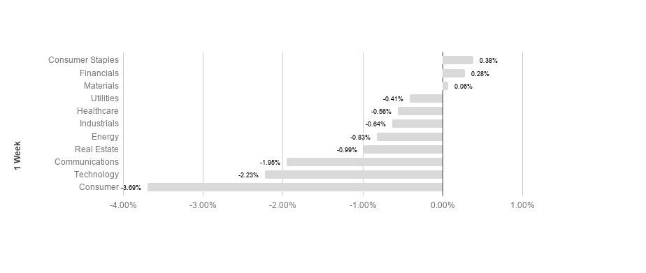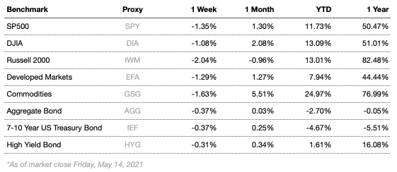 Broad market equity indices finished the week down, with major large cap indices outperforming small cap. Economic data has been mostly encouraging, but the global recovery has a long way to go to recover from COVID-19 lockdowns. S&P sectors returned mixed results this week. Consumer staples and financials outperformed, returning 0.38% and 0.28% respectively. Technology and consumer discretionary underperformed, posting -2.23% and -3.69% respectively. Energy maintains its lead in 2021 with a 40.24% return.