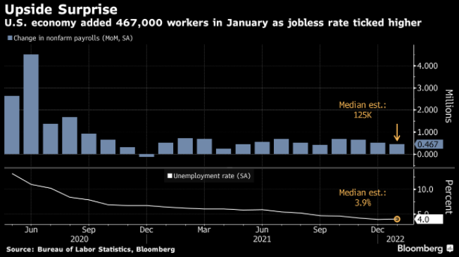 The US labor market added an additional 467K workers in January, easily beating consensus expectations.