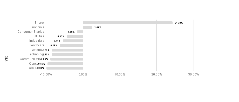 S&P sectors were mixed this week. Energy and consumer discretionary outperformed, returning 4.94% and 3.94% respectively. Real estate and communications underperformed, posting -0.22% and -0.25% respectively. Energy holds the lead YTD, posting 24.30%.