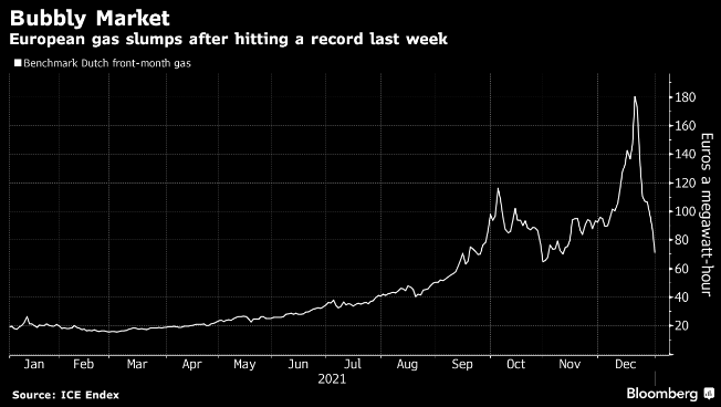 European countries were given some much needed relief as natural gas prices plunged to end 2021. Mild weather as well as shipments from the United States and more than expected deliveries from Russian pipelines helped precipitate the drop.