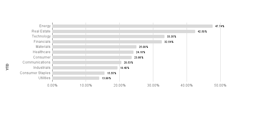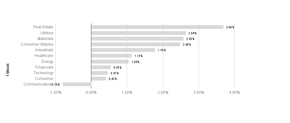 S&P sectors were mostly positive this week. Real estate and utilities outperformed, returning 3.69% and 2.64% respectively. Consumer discretionary and communications underperformed, posting 0.42% and -0.79% respectively. Energy won the 2021 race with a 47.74% return.