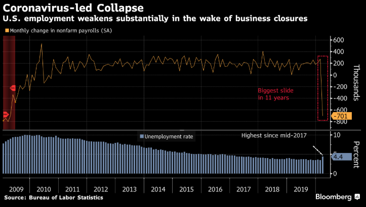 Since the outbreak of the Covid-19 coronavirus, the labor market has declined dramatically. Shut-downs and quarantines have begun taking their toll, as millions of Americans have filed for unemployment, causing the unemployment rate to spike to 4.4%.
