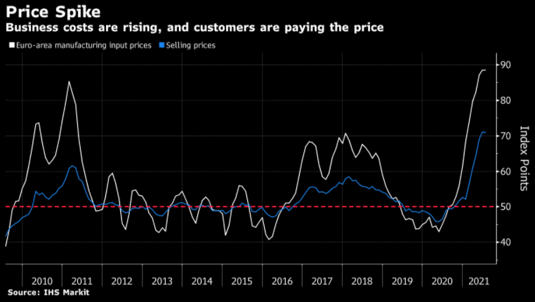 Prices seem to be rising globally, with the Eurozone seeing substantial cost increases for manufacturing. Much of these increases can be attributed to rising prices of inputs such as oil and industrial metals, as supply chains continue to struggle to catch up to global demand.