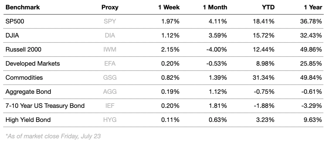 Markets rose this week as PMI data continues its streak of expansionary readings. Economic data was still mostly disappointing for the week, with housing indicators and unemployment claims coming in under expectations. COVID-19 cases have been rising nationally again, with most new cases being attributed to the “Delta” variant, but so far deaths have not been spiking, a new development that likely can be attributed to large swaths of the population having been vaccinated. Overall, the economy is well positioned to continue recovering from pandemic lockdowns, but inflation risks as well as labor challenges and production capacity are eating into productivity.