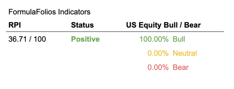 The Recession Probability Index (RPI) has a current reading of 36.71, forecasting a lower potential for an economic contraction (warning of recession risk). The Bull/Bear indicator is currently 100% bullish, meaning the indicator shows there is a slightly higher than average likelihood of stock market increases in the near term (within the next 18 months).