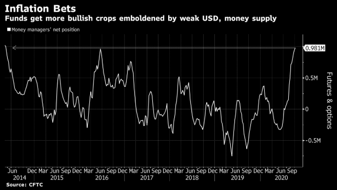 Funds are increasingly buying positions in U.S. crops as macroeconomic trends shift to favor perishable commodities. Two factors in particular, an expanding money supply and a weakening U.S. dollar, are supporting the movements, pushing net long positions to 6 year highs.