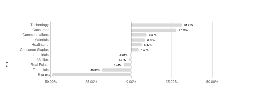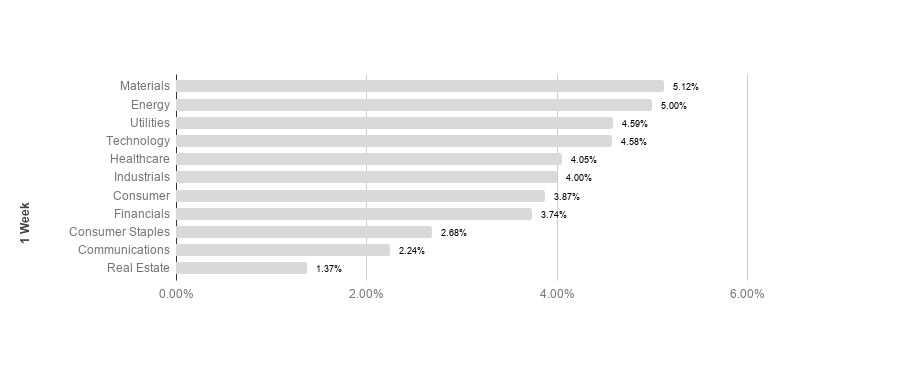 Broad market equity indices finished the week up, with major large cap indices underperforming small cap. Economic data has progressed, but the global recovery still has a long way to go to regain lost jobs and output. S&P sectors returned exclusively positive results this week. Materials and energy outperformed, returning 5.12% and 5.00% respectively. Communications and real estate underperformed, posting 2.24% and 1.37% respectively. Technology leads the pack so far YTD, returning 31.21% in 2020.