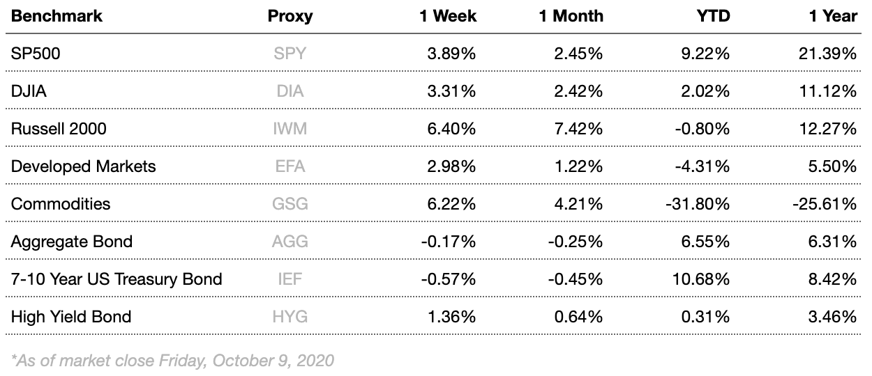 Stocks rose this week, continuing the recovery from the September slump. Economic data was light this week, with services PMI data beating expectations and higher than expected unemployment. Unemployment claims have been choppy but moving downwards, likely indicating slowly recovering labor markets. Unemployment claims are likely to remain elevated for several more weeks, but will likely continue to trend in a positive direction. The persistently high case rates of COVID-19 in the U.S. remains concerning, and possibly may be trending upwards. This increase in cases is likely related to schools reopening and may continue for several more weeks. Negotiations toward a second stimulus package have supposedly made progress, but a final deal has yet to take shape. While House Democrats and the Whitehouse are reportedly making progress, Senate Republicans are not on board with any large scale stimulus and will not likely back the plan.
