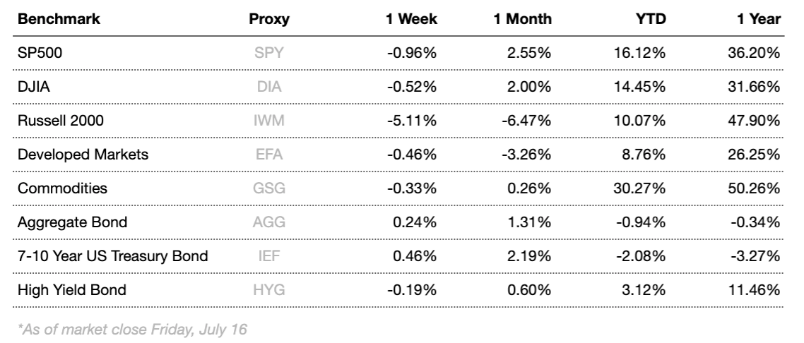 Markets fell this week as markets grappled with a recovery that is looking more and more uncertain. Economic data was mixed, with disappointing readings coming from consumer sentiment along with industrial production, both of which came in under expectations. Retail sales came in above expectations, as did CPI. The most impactful event during the week was the senate testimony of Fed Chair Powell. Powell faced multiple questions concerning the Fed’s inflation outlook. Powell did his best to quell concerns and reassure markets that the inflation environment is temporary, but consistently rising inflation is beginning to spook consumers and some analysts. Overall, the economy is well positioned to continue recovering from pandemic lockdowns, but inflation risks eating into productivity.