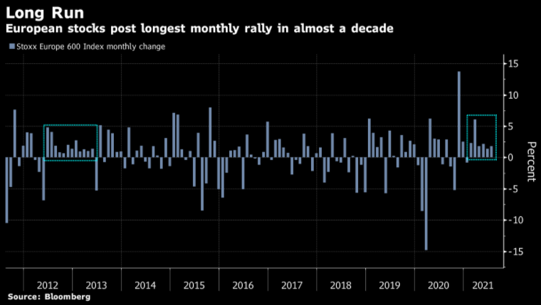 European stocks have been on a hot streak, registering six months of price gains. Investors have been upbeat about the recovery and growth prospects in Europe.