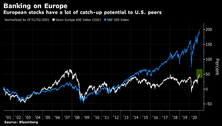 Since 2013, European stocks have lagged behind U.S. stocks. Analysts are beginning to pay attention to European equities again, as many believe that Europe may be poised to start catching up.