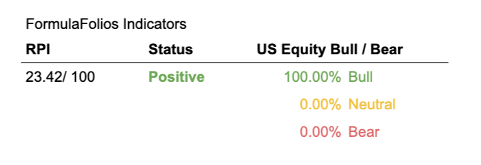 The Recession Probability Index (RPI) has a current reading of 23.42, forecasting a lower potential for an economic contraction (warning of recession risk). The Bull/Bear indicator is currently 100% bullish, meaning the indicator shows there is a slightly higher than average likelihood of stock market increases in the near term (within the next 18 months).