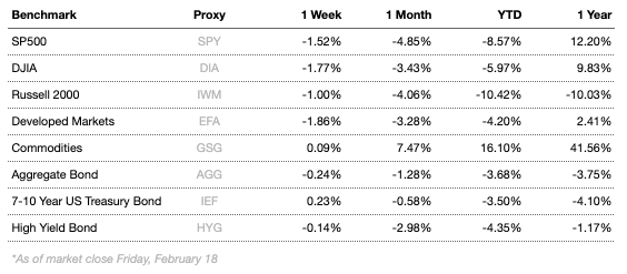 US equity markets fell this week as geopolitical tensions look poised to boil over. Russia has all but yelled “Charge!” as it is poised to invade its neighbor Ukraine. While US exposure to the conflict is minimal from both a military perspective and an economic perspective, effects of an invasion could still be felt around the globe, especially if reactionary sanctions from western countries target Russian energy. If sanctions do target Russian oil and gas, expect pain caused by already inflated energy costs to increase. In good news, industrial production and capacity stateside beat expectations, hopefully indicating that production constraints may start easing. While war is never a welcome headline, the primary risk to the US economy right now remains inflation. Time will tell whether the Fed is doing too little too late on inflation, but their willingness to act late is better than continuing to invoke that inflation is “transitory.” Overall, the economy is still recovering well from pandemic lockdowns. The biggest threat to the economy remains inflation, and the Fed now appears to be taking the threat more seriously.