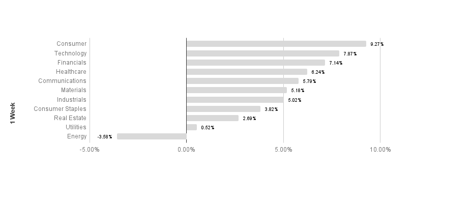 S&P sectors were mostly positive this week. Consumer discretionary and technology outperformed, returning 9.27% and 7.87% respectively. Utilities and energy underperformed, posting 0.52% and 3.58% respectively. Energy holds the lead YTD, posting 32.42%.