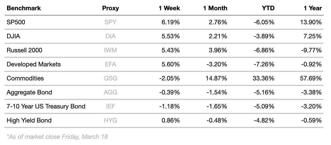 US equities jumped this week as the cost of oil fell. Economic indicators revealed an economy still running hot, with retail sales and manufacturing indicators all showing growth. The biggest news came from the Fed, as the FOMC voted to raise rates by 0.25%, in line with analyst expectations. This marks the first rate hike in over three years, and the beginning of a more hawkish approach by the Fed. In spite of the economic developments here at home, all eyes remain fixed on the Russian invasion of Ukraine and its possible outcomes. While war is never a welcome headline, the primary risk to the US economy right now remains inflation. Time will tell whether the Fed is doing too little too late on inflation, but their willingness to act late is better than continuing to invoke that inflation is “transitory.” Overall, the economy is still recovering well from pandemic lockdowns. The biggest threat to the economy remains inflation, and the Fed now appears to be taking the threat more seriously.