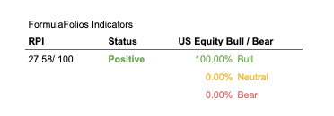FormulaFolios has two simple indicators we share that help you see how the economy is doing (we call this the Recession Probability Index, or RPI), as well as if the US Stock Market is strong (bull) or weak (bear).In a nutshell, we want the RPI to be low on a scale of 1 to 100. For the US Equity Bull/Bear indicator, we want it to read at least 66.67% bullish. When those two things occur, our research shows market performance is typically stronger, with less volatility.