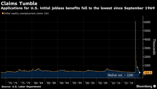 Unemployment claims have been on steady decline, registering the lowest level in more than 50 years this week. The labor market is clearly recovering, but overall the labor market still has quite a bit of ground to recover to get back to pre pandemic levels.