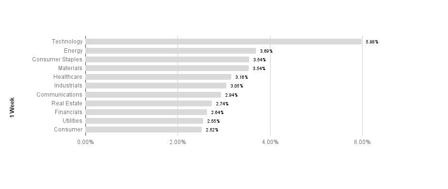 S&P sectors were positive this week. Technology and energy outperformed, returning 5.98% and 3.69% respectively. Utilities and consumer discretionary underperformed, posting 2.55% and 2.52% respectively. Energy has the lead in 2021 with a 50.49% return.