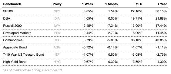 Broad market equity indices finished the week up with major large cap indices outperforming small cap. Economic data has been mostly encouraging, but the global recovery still has a long way to go to recover from COVID-19 lockdowns.