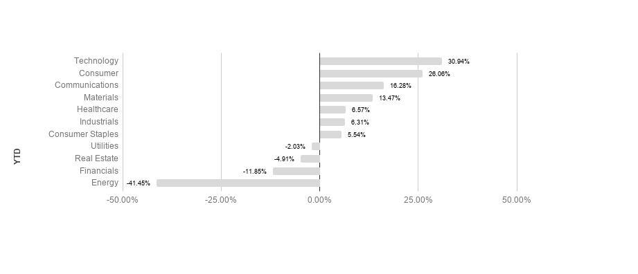 Broad market equity indices finished the week mixed, with major large cap indices underperforming small cap. Economic data has been solid, but the global recovery is still threatened by COVID-19. S&P sectors returned mixed results this week. Energy and materials outperformed, returning 4.99% and 1.06% respectively. Healthcare and utilities underperformed, posting -3.00% and -3.92% respectively. Technology leads the pack so far YTD, returning 30.94% in 2020.