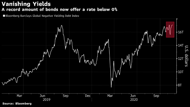 The percentage of global bonds with yields below 0% have reached new record highs, surpassing the previous record set in 2019 at north of $17 trillion. This recent trend likely highlights a high degree of risk aversion in fixed income markets.