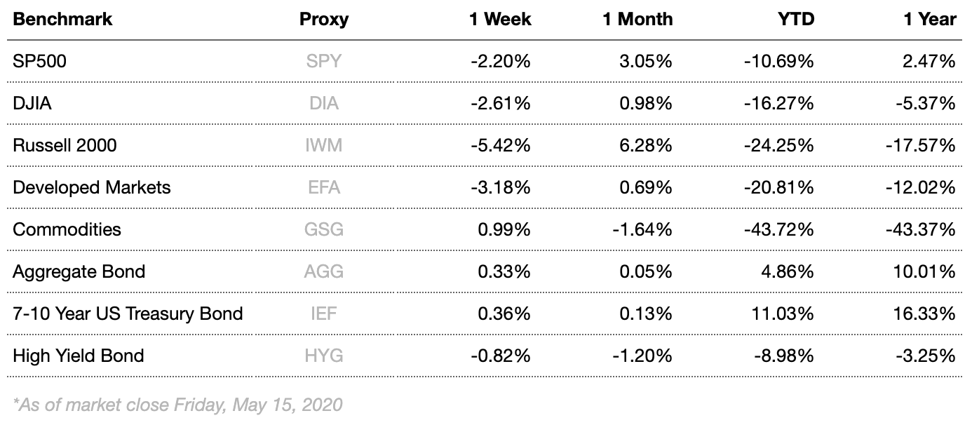 Markets fell this week as the Fed sounded a warning concerning economic developments. In positive news, U.S. states have continued to permit further non-essential business openings in spite of the continuing Covid-19 threat. Equities finished the week down after mixed economic data and the Fed prompting caution. Healthcare led the S&P sectors this week, finishing ahead of consumer discretionary and communications to round out the strongest sectors. Analysts will likely continue to observe production and consumption adjustments made by market participants closely after shutdowns begin to wind down. Tensions with China continue to be an unknown and will likely remain in focus. Unemployment is likely to remain elevated for several more weeks, but economic activity is likely to begin a slow and steady return to normal in the coming weeks and months. Infection data is becoming more accurate as testing becomes more widely disseminated, helping to better assess economic options.