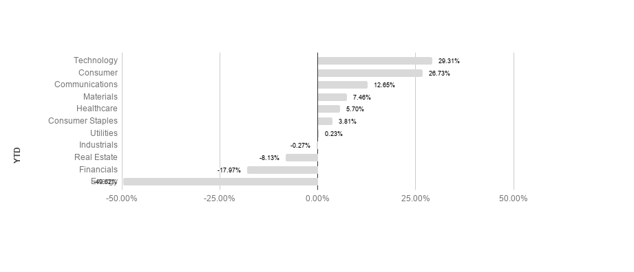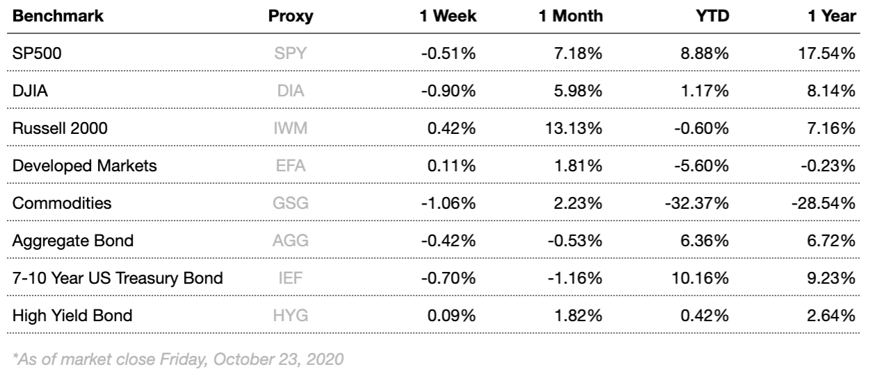 Broad market equity indices finished the week mixed, with major large cap indices underperforming small cap. Economic data has been solid, but the global recovery is still threatened by COVID-19. S&P sectors returned mixed results this week. Communications and utilities outperformed, returning 2.13% and 1.18% respectively. Consumer staples and technology underperformed, posting -1.39% and -2.21% respectively. Technology leads the pack so far YTD, returning 29.31% in 2020.