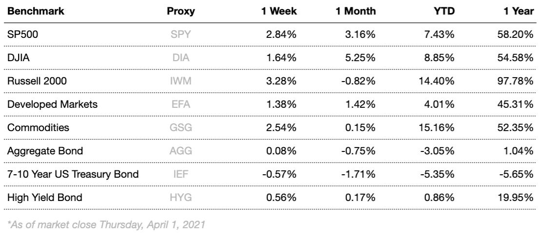 Overseas, developed markets underperformed emerging markets. European indices were positive, with Japanese markets also notching a positive week. Improving prospects against the pandemic as well as improved prospects for economic recovery should continue to help lift markets globally over time.