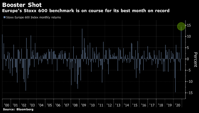 European stocks have skyrocketed during November, and may even set a new record for a monthly performance mark. Europe was battered in the fall by resurgent COVID-19 spread, making recent news of effective vaccines extremely supportive for European stocks.