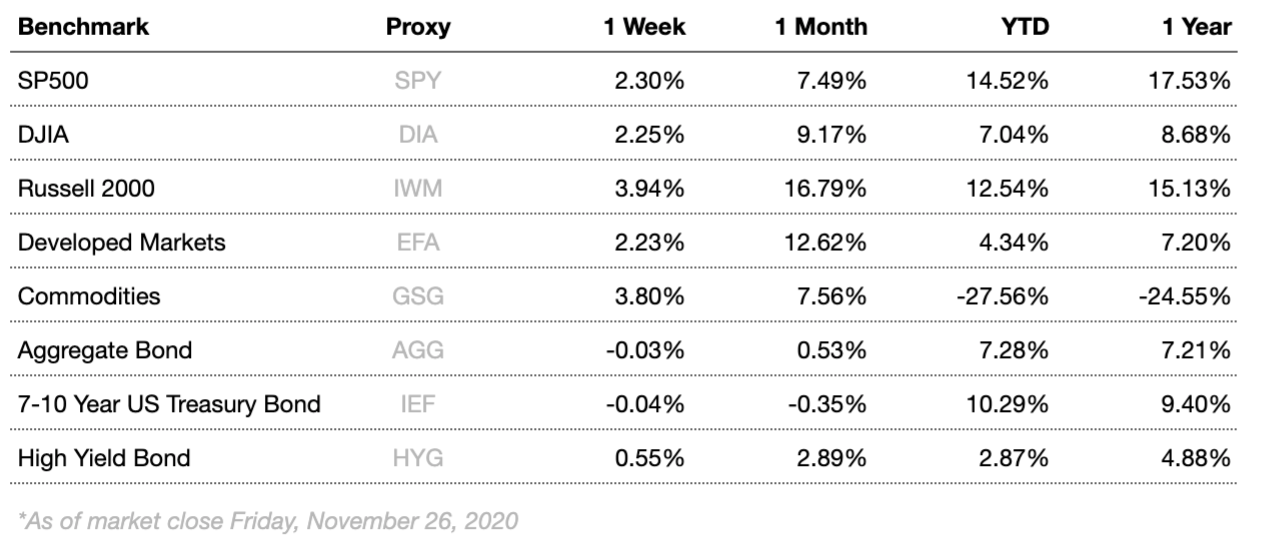 Thanksgiving week has come and gone, oBrookstonecially kicking off the Christmas season. Stocks rose this week as markets continue to be encouraged by the progress in COVID-19 vaccine trials. Globally, COVID-19 infections continue to increase. New daily infections in the U.S. remain stubbornly above 100K. Economic data was mostly positive this week with spending, housing and manufacturing all beating expectations. Unemployment claims have been choppy but moving downwards, likely indicating slowly recovering labor markets. Recently, unemployment declines have slowed somewhat, prompting questions as to whether or not the recovery may be coming to a halt. The persistently high and increasing case rates of COVID-19 in the U.S. remain concerning, and restrictive measures have begun being reinstated in some areas. The increase in cases has been statistically correlated with schools reopening, and as the flu season sets in transmission rates may increase even further.
