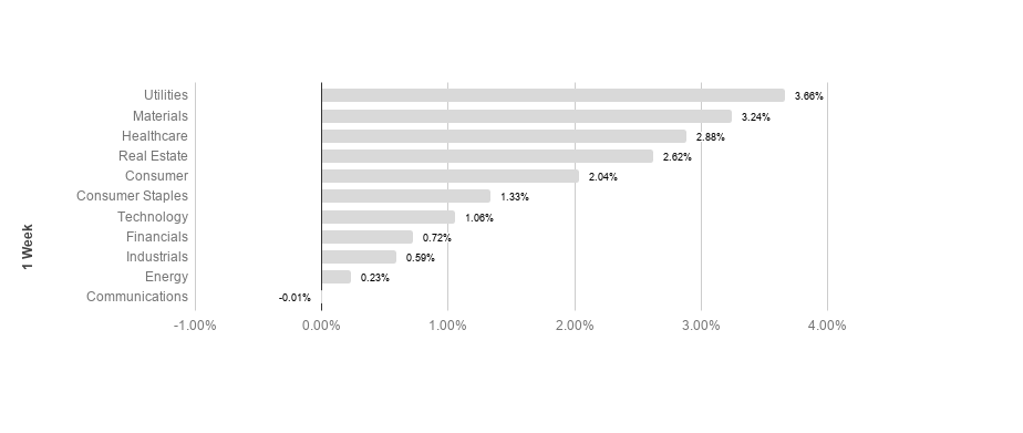 Broad market equity indices finished the week up, with major large cap indices outperforming small cap. Economic data has been encouraging, but the global recovery has a long way to go to recover from COVID-19 lockdowns. S&P sectors returned almost exclusively positive results this week. Utilities and materials outperformed, returning 3.66% and 3.24% respectively. Energy and communications underperformed, posting 0.23% and -0.01% respectively. Energy maintains its lead in 2021 with a 27.63% return.