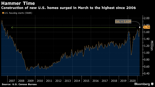 Markets rose this week as economic data gave analysts a positive surprise. Initial unemployment claims set a pandemic era record low, while manufacturing data continued to impress and housing starts soared. Retail sales also soared, making up for disappointing sales figures in March, which represented an unusual February month suppressed by a cold weather spell. Overall, the economy remains well positioned to perform exceptionally in 2021 based on the most recent economic data. New COVID-19 infections moved slightly higher again this week, with 7 day moving averages increasing by around 2K a day over the prior week. The past four weeks have some analysts seeing cause for concern as rates have been increasing, but rates are increasing at a decreasing rate, hopefully indicating that the trend of increasing spread is a temporary circumstance.