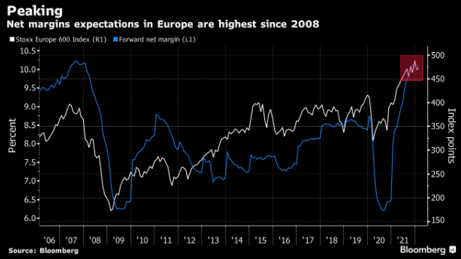 Expectations indicate that investors expect big things from European firms. Forward net margin expectations are at the highest levels since the financial crisis in 2008.