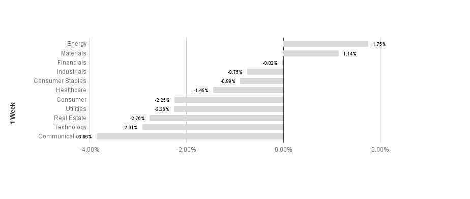 S&P sectors were mixed this week. Energy and materials outperformed, returning 1.75% and 1.14% respectively. Technology and communications underperformed, posting -2.91% and -3.86% respectively. Energy holds the lead YTD, posting 26.47%.