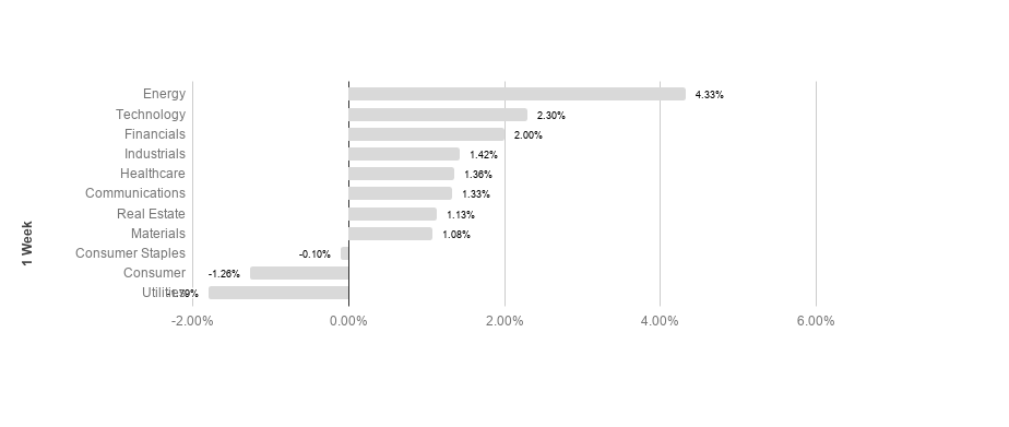 Broad market equity indices finished the week up, with major large cap indices underperforming small cap. Economic data has been steadying, but the global recovery has a long way to go to recover from COVID-19 lockdowns. S&P sectors returned mostly positive results this week. Energy and technology outperformed, returning 4.33% and 2.30% respectively. Consumer discretionary and utilities underperformed, posting -1.26% and -1.79% respectively. Energy maintains its lead 2021 with a 17.07% return.